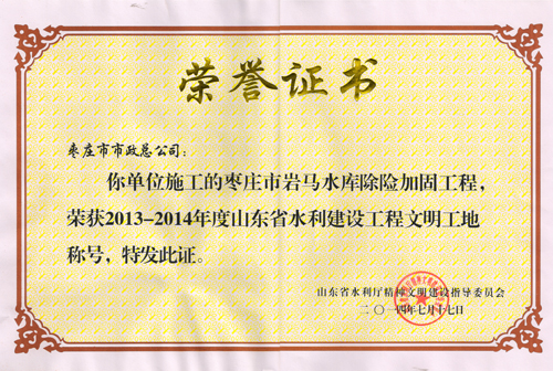 “棗莊市巖馬水庫(kù)除險(xiǎn)加固工程”榮獲2013—2014年度山東省水利建設(shè)工程文明工地稱號(hào)