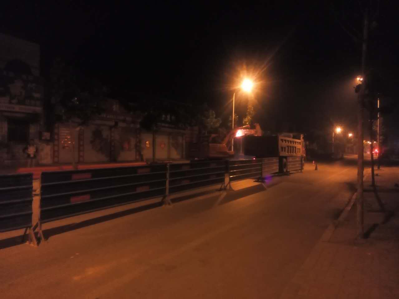 由于該工程緊靠利民批發(fā)市場(chǎng)、鋼材批發(fā)市場(chǎng)及香港街等大型物資集散地,車流、人流量大,沿線營(yíng)業(yè)門市眾多,本就狹窄的道路無法提供有效的工作寬度。項(xiàng)目管理人員根據(jù)工地現(xiàn)狀,制定了白加黑的施工方案。在白天正常施工的同時(shí),將開挖裝車、商砼澆筑等對(duì)工作寬度要求高的工序放在晚上進(jìn)行。