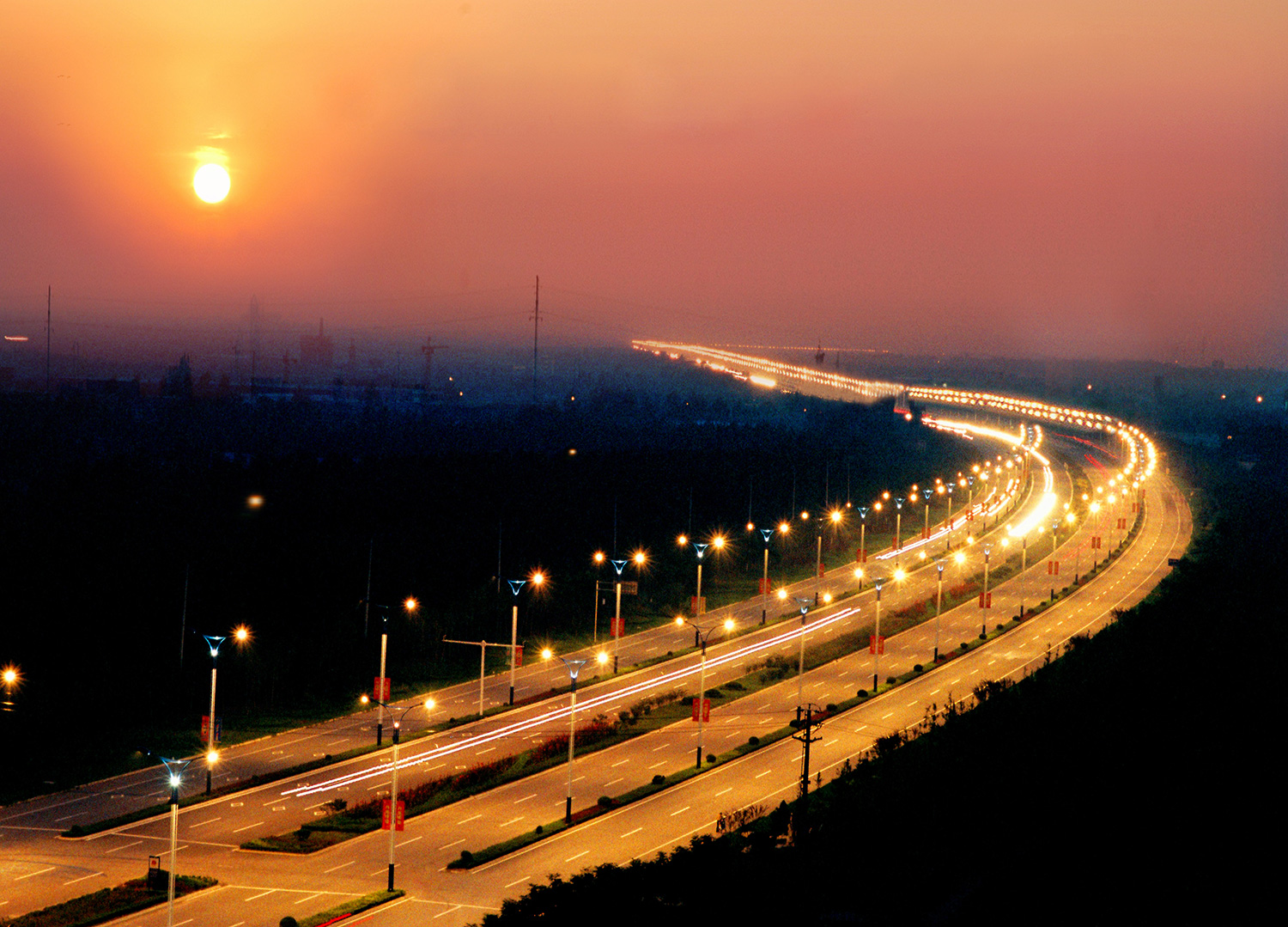 “遠(yuǎn)遠(yuǎn)的街燈明了,好像閃著無(wú)數(shù)的明星;天上的明星現(xiàn)了,好像點(diǎn)著無(wú)數(shù)的街燈”,光明大道路燈在夜晚就像一座金色的彩橋,照…